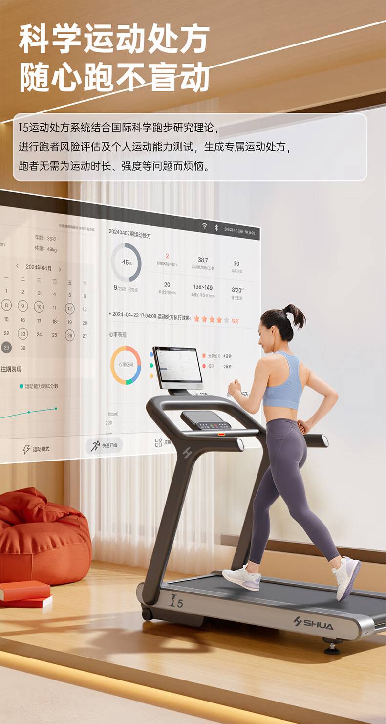 好博SH-T580T I5跑步机,科学运动处方,随心跑不盲动,可根据个人运动处方心率区间及跑者的实时心率情况,自动调节速度或坡度,犹如你的专属“配速员”让你随“心”而跑无负担。