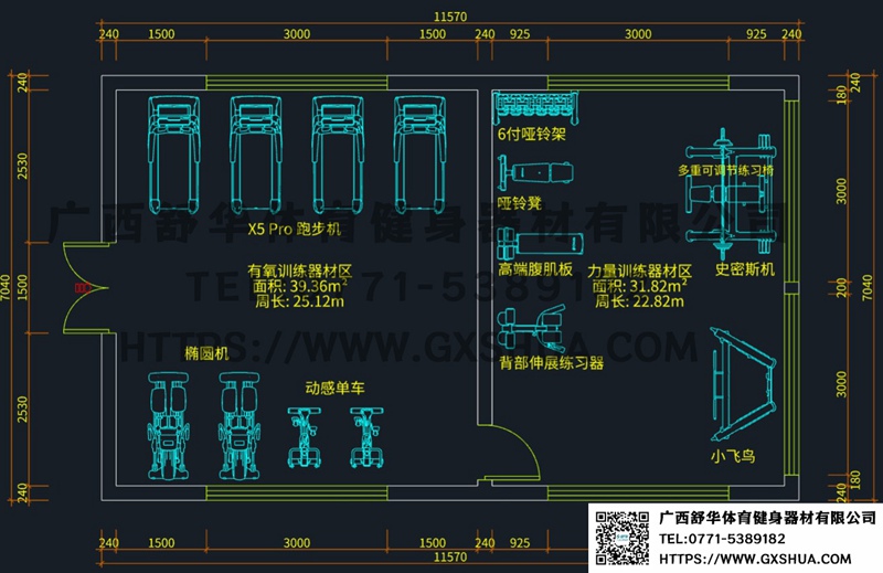 场地尺寸:6m*6.65m(有氧器材区)+4.85*6.65(力量训练器材区)
