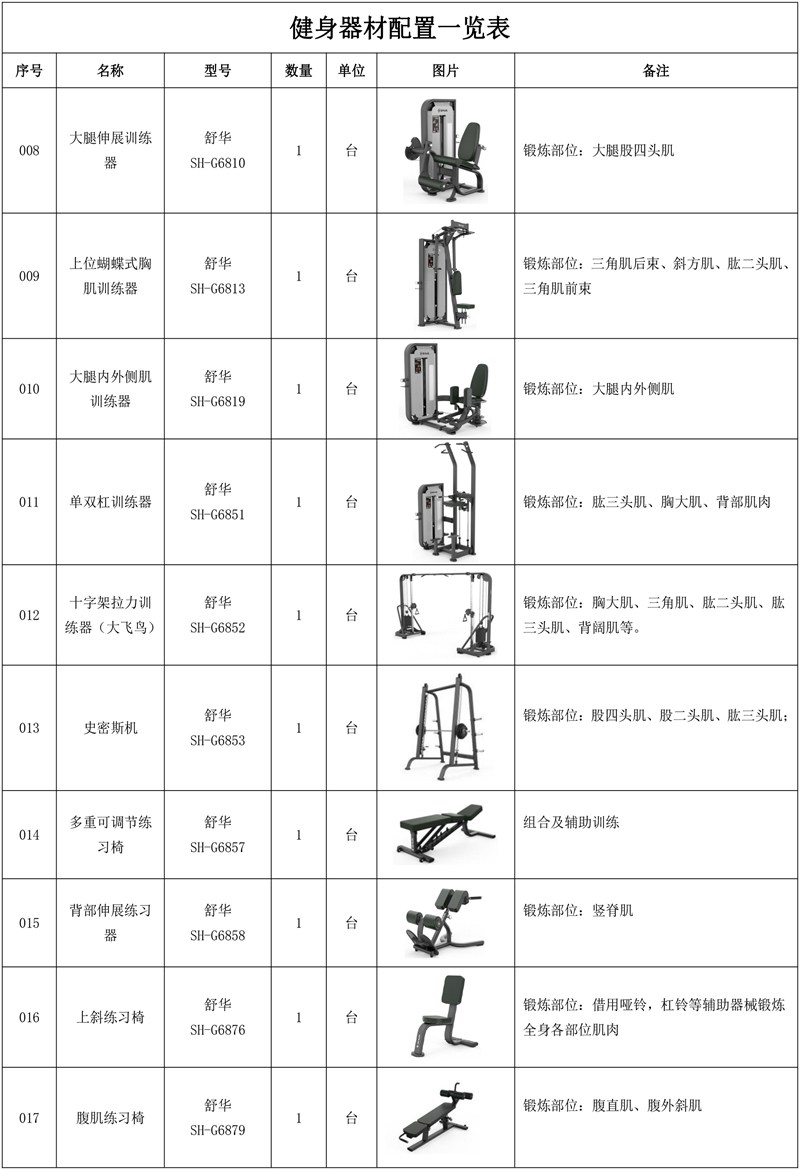 13.好博史密斯机SH-G6853*1台-锻炼股四头肌、股二头肌、肱三头肌;史密斯机采用固定轨迹的杠铃设计,大大降低了训练过程中的安全风险,通过深蹲、卧推、肩推等经典动作,可以针对性地锻炼腿部力量、上肢力量、背部肌群、胸部塑形以及肩部稳定等,从而全面提升身体素质,满足不同的健身需求;