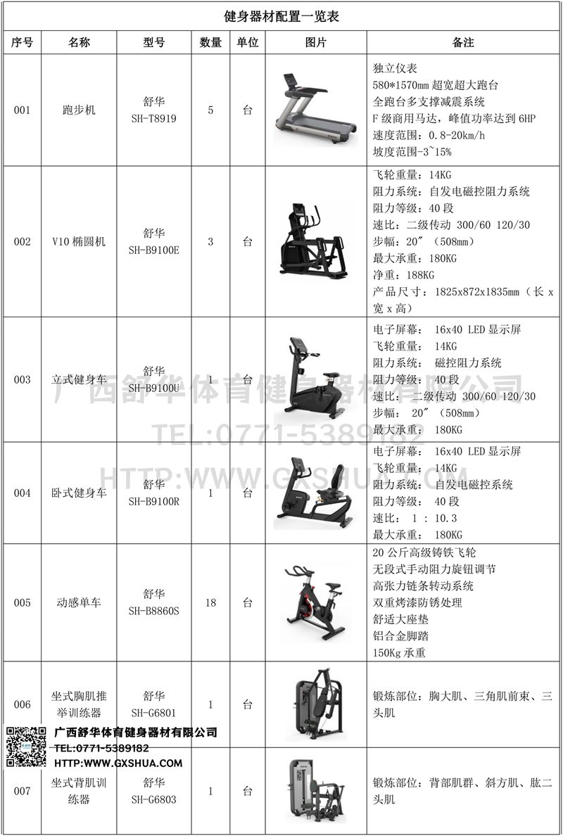 1.好博V9跑步机SH-T8919*5台-独立仪表-简洁大气,全新外观设计,健康运动新选择;心率监测功能,可通过手握心率、无线心率带等不同方式实时采集心率数据;580*1570mm超宽超大跑台-跑感舒适,跑台整体安全稳定;全跑台多支撑减震平台,保证跑台超强支撑力,达到180kg支撑,满足专业健身房需求。